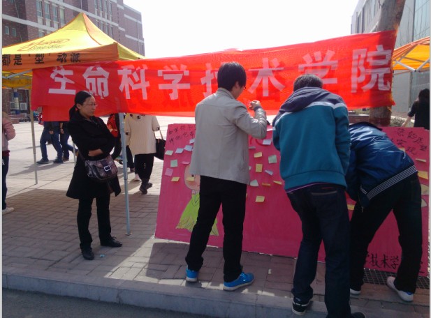 为弘扬十八大精神,构建和谐文明社会,响应学院“向雷锋学习”的号召,充分展现当代大学生的精神风貌,深入发扬奉献、友爱、互助、进步的时代新风,在纪念学雷锋活动开展50周年之际,生命科学技术学院于3月8日上午十一点半在西区文化广场举办“爱心许愿墙”活动。