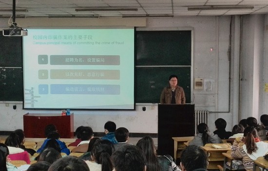 刘凯老师通过具体案例分析的形式向同学们讲述了发生在当代大学生身边的各色诈骗现象,让大家深刻认识到当今社会诈骗形式的纷繁复杂和无孔不入,手机短信、电话、QQ、推销等都有可能成为诈骗者骗人的途径。刘老师告诉我们要时刻保持警惕:首先,不要将有效证件轻易借给他人,不要随便将个人信息向他人透漏,以防行骗者利用所提供的信息进行诈骗;其次,不要轻信陌生人,不要被陌生人的花言巧语所迷惑;第三,切不可轻信街头广告或网上勤工助学、求职应聘等信息,防止短信、网络等诈骗现象的发生;最后刘老师强调说“天下没有免费的午餐”,遇到任何事情都不要抱有侥幸心理去贪图小利,突如其来的利益之后往往隐藏着未知的危险。