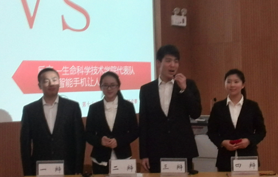 我院和基础医学院分别以“智能手机让人更疏远”和“智能手机让人更亲近”为辩题进行激烈对抗。在双方自我介绍的同时我院四位辩手现场表演的小话剧让大家耳目一新,紧接着比赛正式开始。首先,双方一辩开篇确立论点,分别阐述了自己对智能手机的看法与观点接着辩论赛的第二个环节,双方二辩三辩相互进行的提问,比赛顿时推向高潮,气氛变的十分紧张、火药味十足正反两方针对以智能手机对我们的衣、食、住、行各方面的影响为理论依据来反驳对方的观点,语气坚定且时而带些流行色彩,不失幽默感。双方互不相让打的难分难舍。四辩的总结陈词赢得了同学们的掌声。