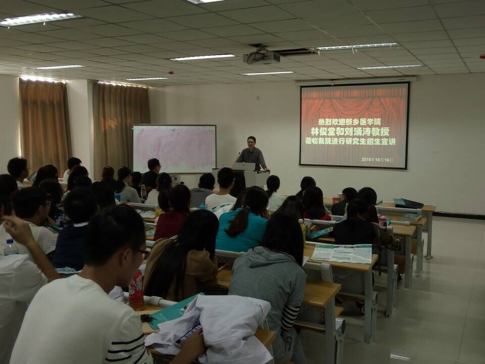 首先林俊堂教授向大家讲解了关于2016年生物学招生的具体情况,指出本校将会针对神经生物学、细胞生物学、生物化学与分子生物学和微生物学这五个考研方面进行招生。随后,林教授分别从强大的师资力量、丰富的科研项目、完善的实验器材等方面向大家介绍了新乡医学院与其他学校同时竞争的优势。他强调,生命科学技术学院建院以来师生始终保持着“厚德博学,至爱致用”的校训,形成了“诚朴友善、乐业思进、勤谨尚实”的院风。随后,刘涌涛教授就研究生管理、培养、奖学金设置科研项目申报等方面向大家做了详细说明,他坚信以本校的多方面的优势有能力培养出一批优秀的科研人才。