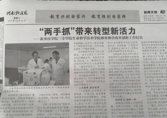 近日,我院院长卢龙斗教授接受了河南科技报记者、采访中心主任吕晓编辑的采访。卢龙斗就生命科学技术学院的发展思路、教学改革和科学研究方面作了一一介绍,并回答了吕晓感兴趣的问题。随后不久,河南科技报分别以《河南省山楂综合利用工程研究中心--开创山楂“高效提取、精深加工”利用新模式》和《“两手抓”带来转型新活力》为题在综合新闻与教育天地版面刊文,报导了我院的科学研究成果和教学改革新模式。