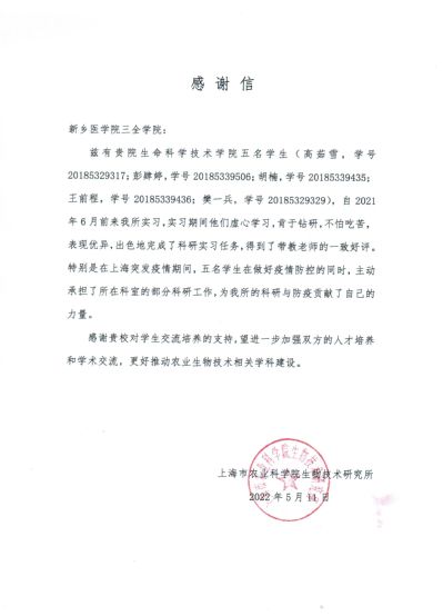 5月22日,我院收到了来自上海农科院的感谢信,对我院在农科院实习的五位同学自2021年6月至今的实习情况给予高度评价,对他们为科研实验的开展所做的工作表示感谢。特别是今年上海突发新冠肺炎疫情期间,几位同学更是坚守实验岗位,并且积极参与疫情防控志愿工作。