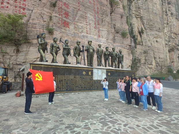在回龙精神雕塑前,全体党员重温入党誓词并庄严承诺:调研作风学回龙、经费使用效回龙、服务群众比回龙。
