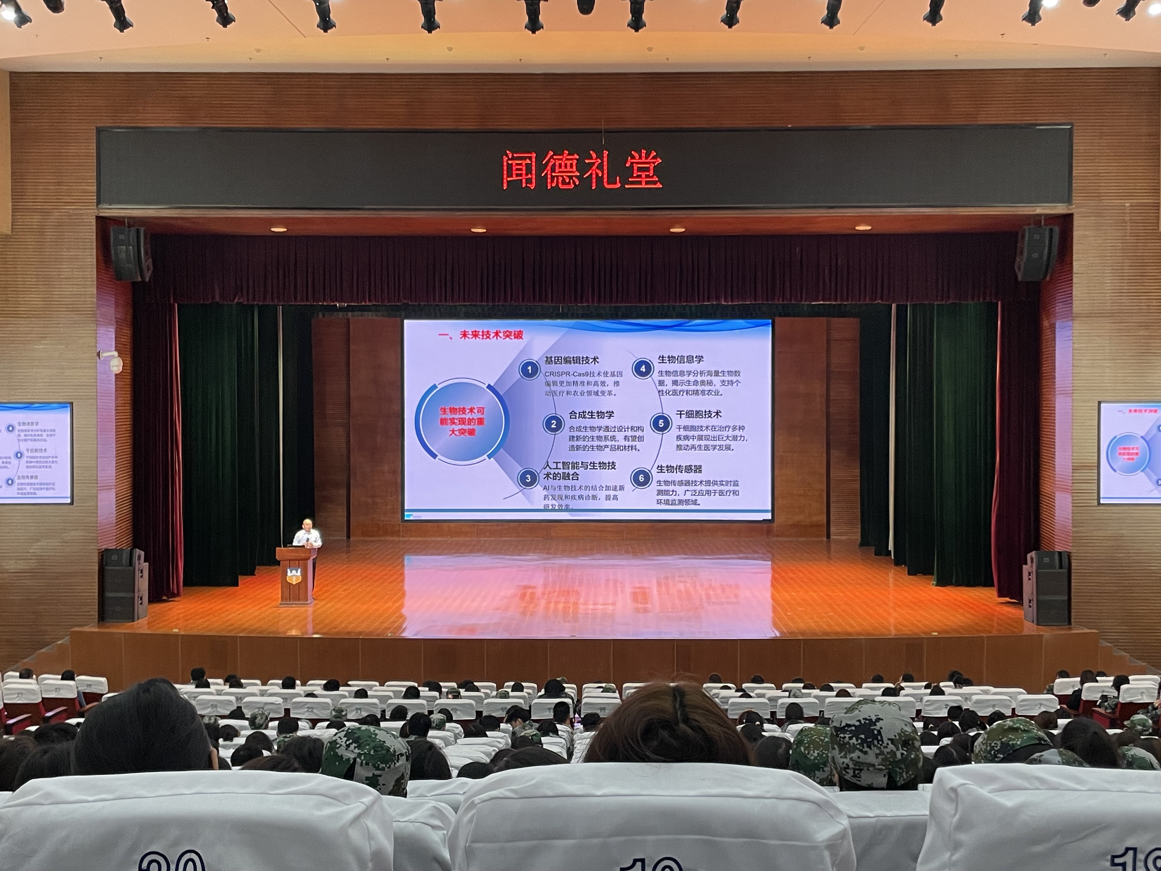 未来趋势与挑战:他深入介绍了基因编辑技术、合成生物学、人工智能与生物技术的融合、生物信息学、干细胞技术、生物传感器等前沿领域,生动地阐述了如何利用这些技术重塑未来,同时也指出了在伦理、安全和技术瓶颈等方面所面临的挑战,引导同学们既要仰望星空,也要脚踏实地。