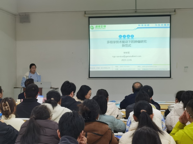 首场讲座由通用生物(安徽)股份有限公司NGS技术支持主管贺学英主讲。她以“多组学技术驱动下的肿瘤研究新范式”为主题,系统介绍了微生物多样性、宏基因组、转录组、代谢组、蛋白组及表观组学等多组学技术在肿瘤研究中的整合应用。贺学英结合自身近八年的技术支持和项目经验,通过实际案例分享了多组学方案设计、数据挖掘与成果发表的路径,为在场师生提供了从技术到论文的系统化科研思路。