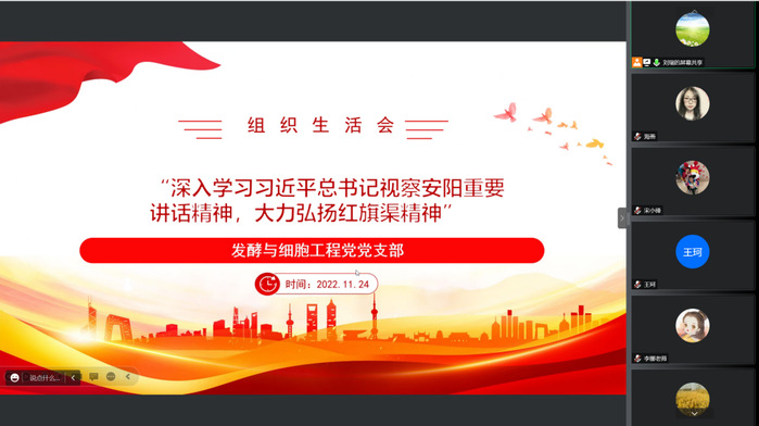 11月24日上午,生命科学技术学院发酵与细胞工程党支部通过腾讯会议召开了“深入学习习近平总书记视察安阳重要讲话精神,大力弘扬红旗渠精神”为主题的组织生活会。会议由支部书记刘瑞主持,支部全体党员参...