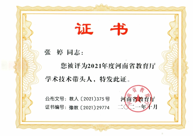 我院教师张婷荣获“2021年河南省教育厅学术技术带头人”称号